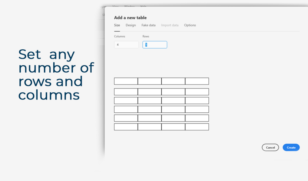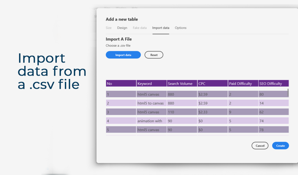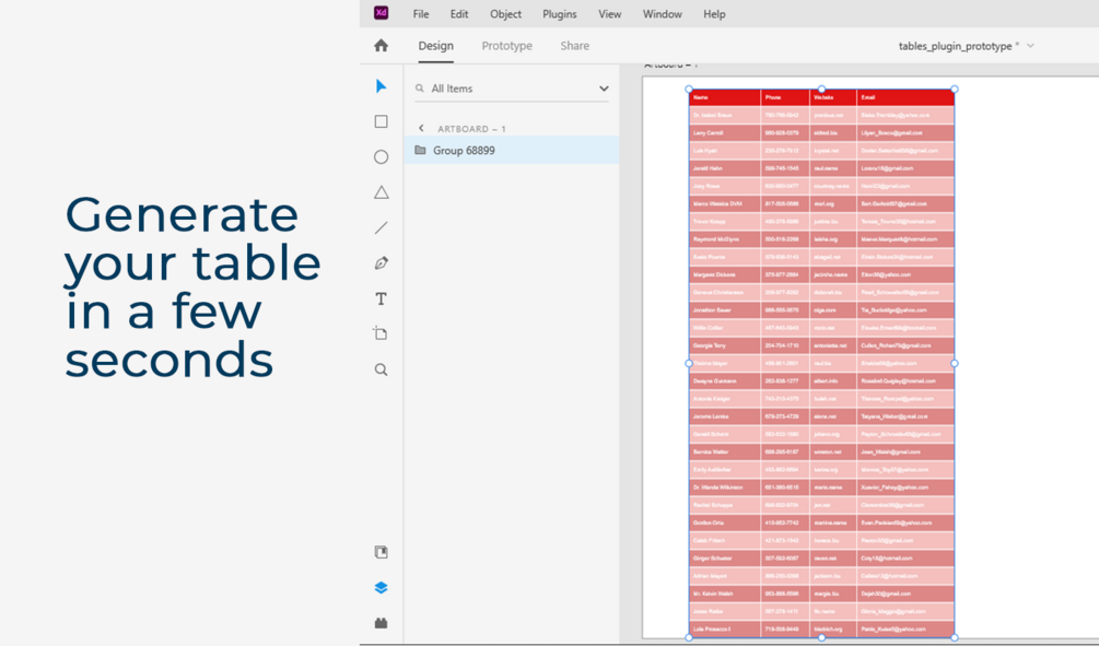 Quickly Generate tables in Adobe XD. Import existing tables from a .CSV file or create a table with dummy data.